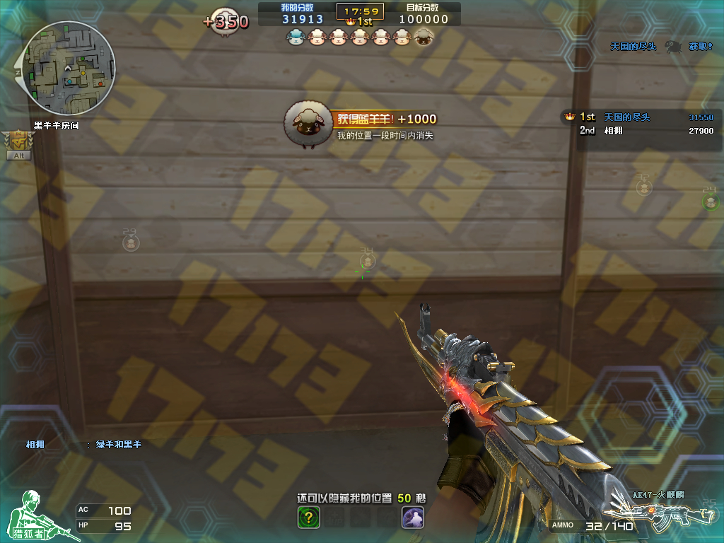 不过提示一点,还是不要过多的依靠最终的金羊。天有不测风云玩家一大群,羊就一只。不定被谁抢到。所以必定要前面积累满足的分数。你比第二名高出个2-3万分金羊没到手第一也是你的。所以就利用好我前面说的那些抢分的办法。行就先提到这,祝我们游戏愉快~