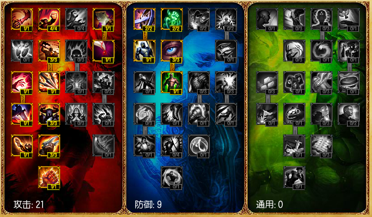 这套天赋是基于第二套符文来的,防御系我牺牲掉了减少2点伤害的不屈,攻击系点出死神,敌方英雄生命低于百分之五十,增加百分之五伤害。法术编织和咒刃编织没有点,双刃剑也是,反而在通用系点出移动速度,强化回程是为了点出召唤师技能冷却。这套符文可以说是偏猥琐的,毕竟,有时候一两点护甲,或者伤害的减少其实并不能救你一命,不是每次都能极限锁血的,而点出移动速度,再配合符文的移速,就算裸破败,移速也能达到360左右,另外,减少召唤师技能百分之十的CD,我相信比防御系的30点生命来的直接,收益也更大。